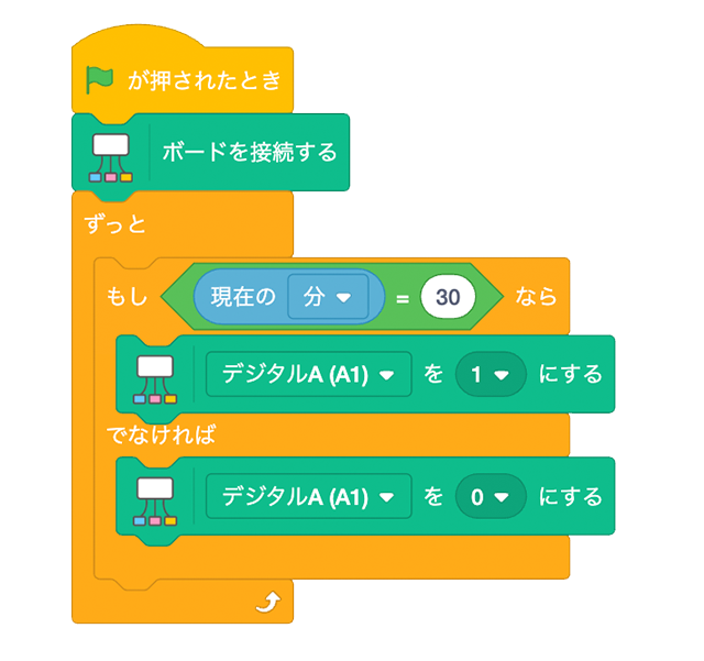 このサンプルプログラムはScratch互換環境「Xcratch」のAkaDako拡張ブロックを使用しています。拡張ブロックの使い方についてはこちらをご覧ください。