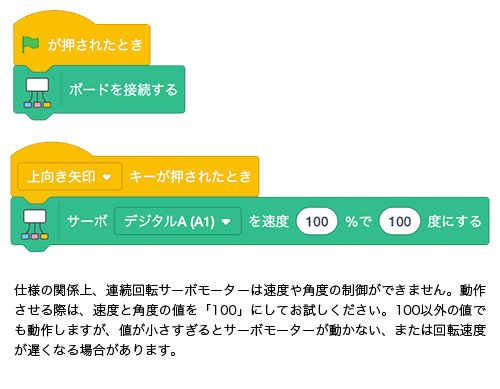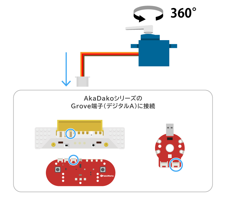 AkaDakoファミリーのGrove端子に接続できるサーボモーターで、連続回転が可能です。Scratch(互換環境 XcratchもしくはStretch3)で制御できます。中学技術情報/計測制御に最適です。